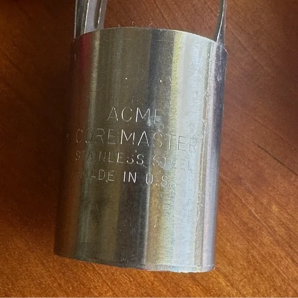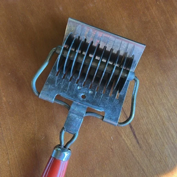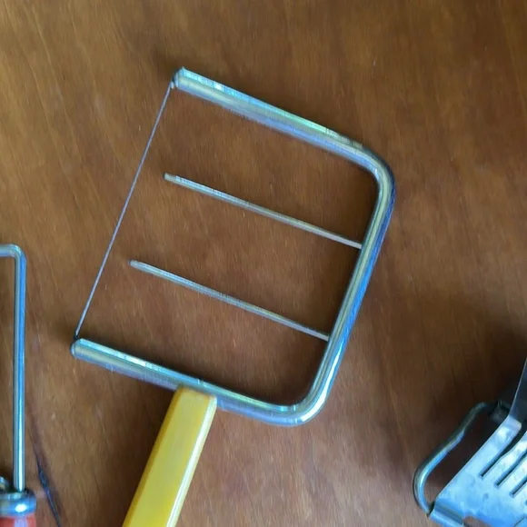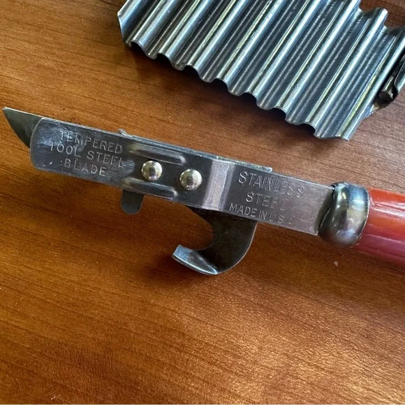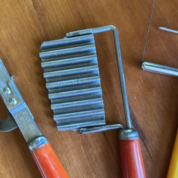 Vintage mid century 1950’s set of 5 red and yellow Bakelite handled kitchen tools. All made in the USA. ~ Acme Coremaster with retractable blade for apples (very sharp)~ Can opener ~ Crinkke cutter for veggies ~ Pasta/Noodle cutter~ Cheese slicer
