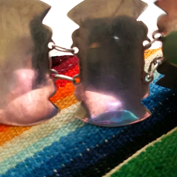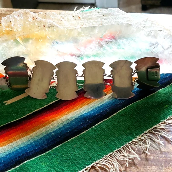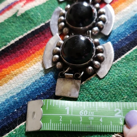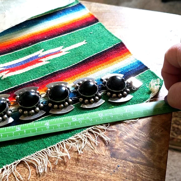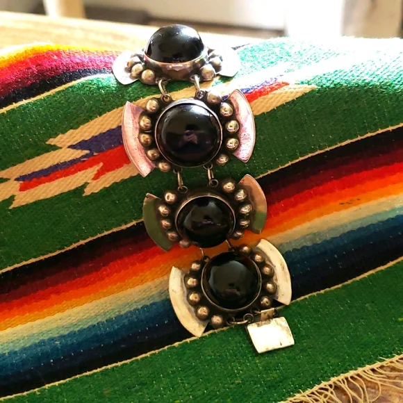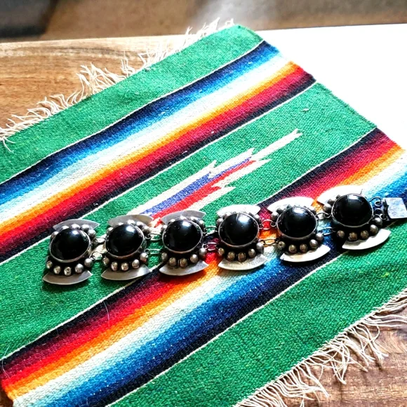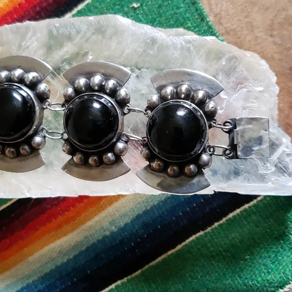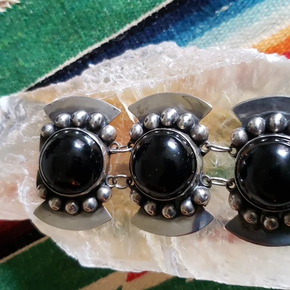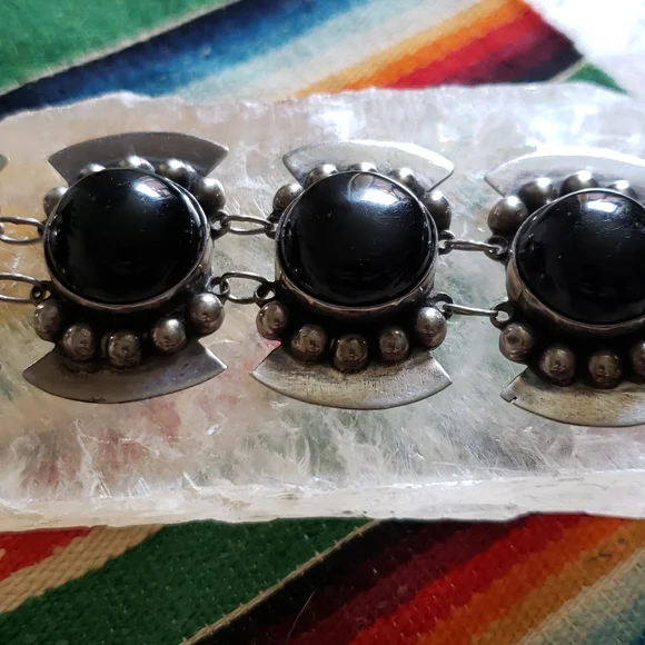 Gorgeous, rare silver and onyx Taxco bracelet from between 1920 and 1940. These bracelets are getting more difficult to find as collectors grab them up.Condition Good vintage condition with some bends in the silver as pictured.These could easily be fixed by a jeweler or do it yourself. Features Classic Mexican Taxco styleLarge onyx cabochons Measurements on photos Handcrafted artisan made