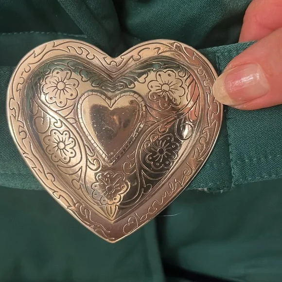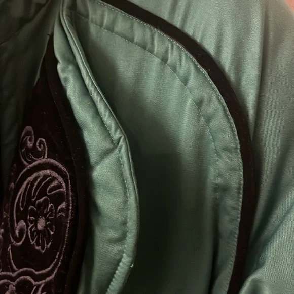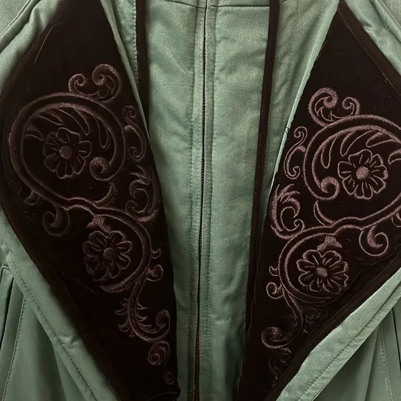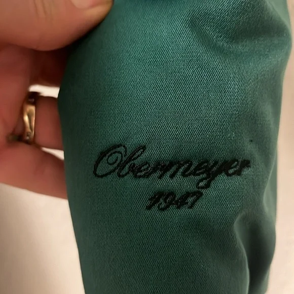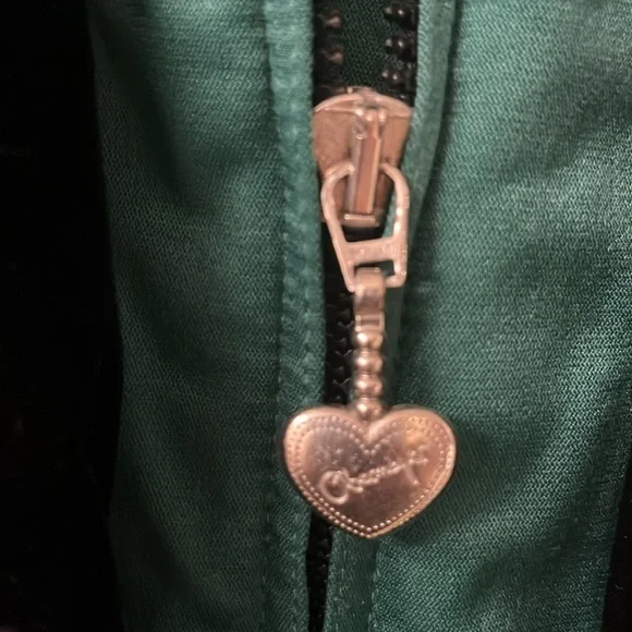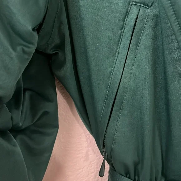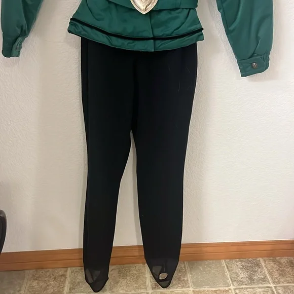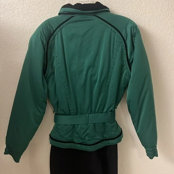 Vintage Obermeyer zip up, size 6, green and black one piece ski suit. Black velveteen embellishment. Silver heart belt and buttons on the front and sleeves. Quilted padded Lining. Four zipper pockets two on the outside and two on the inside top. Shoulder pads. Pristine looks brand new.Measurements are approximate Jacket neck to bottom of jacket 25 1/2”Pant top to stirrup 39”Top to bottom 59”Armpit to armpit 22”Sleeve armpit to bottom 18 1/2”