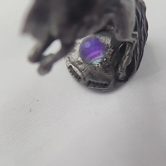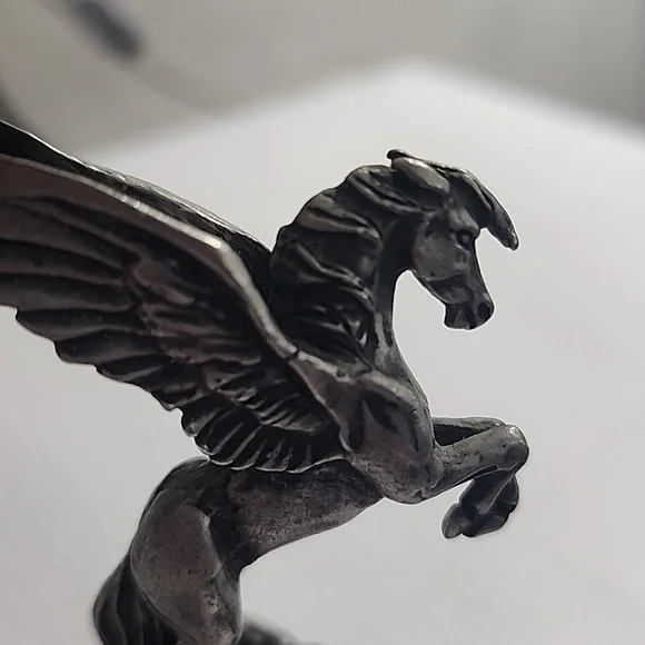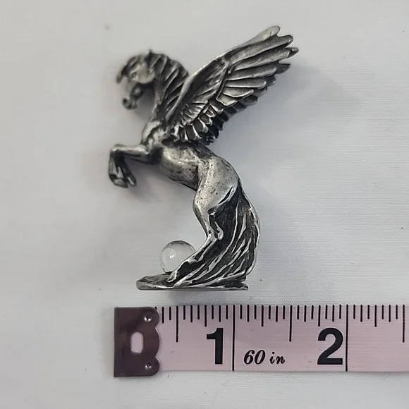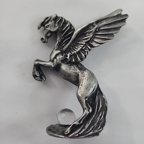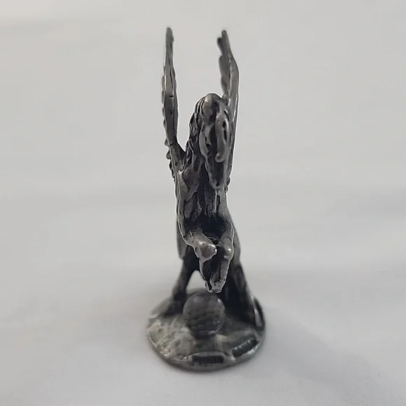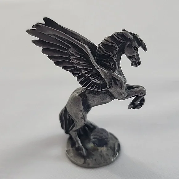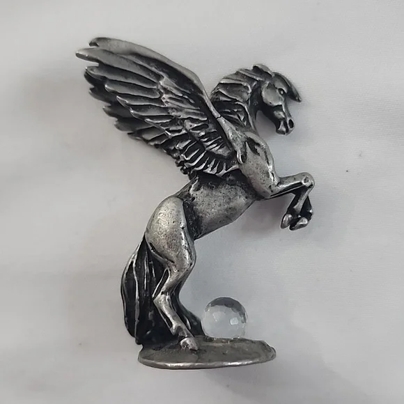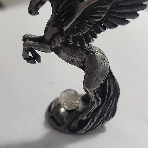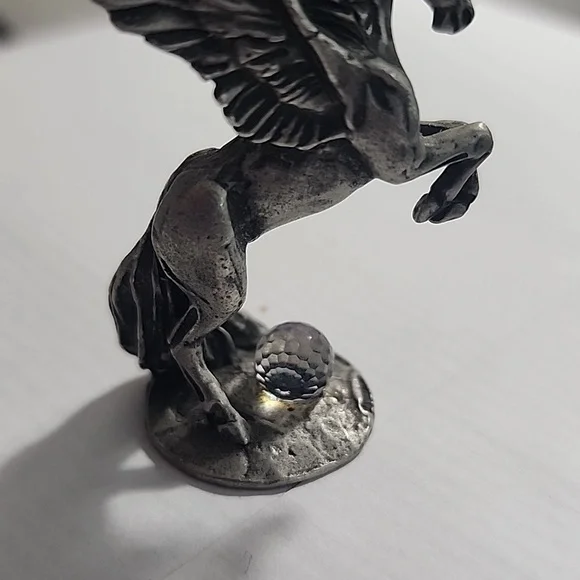 Excellent pre-owned vintage condition Pewter Pegasus with a crystal ball at the base.Adorable and rare. Has been in my collection since the late 1970s. It's time to downsize my collectibles. Please see all photos for measurements and condition. Please ask all questions as this is sold as is. I love to accept all reasonable offers, just ask. Non-smoking and dog friendly home. I always ship out the same or the next business day.