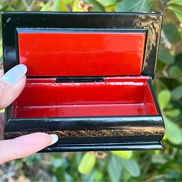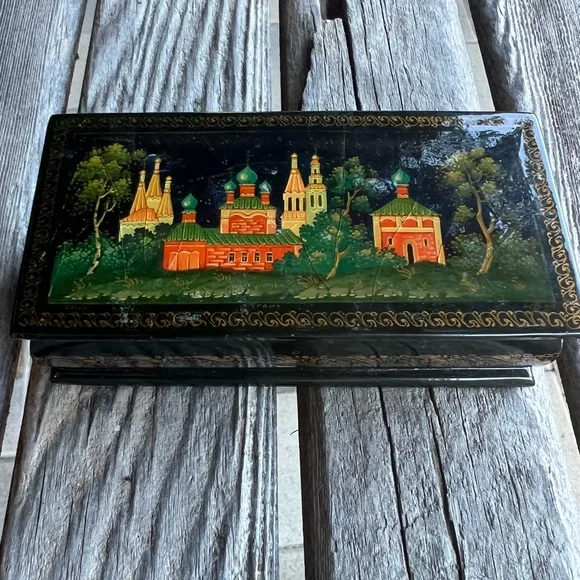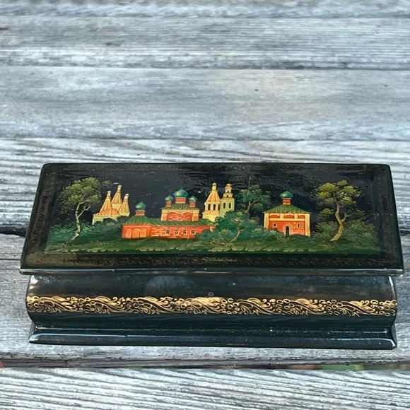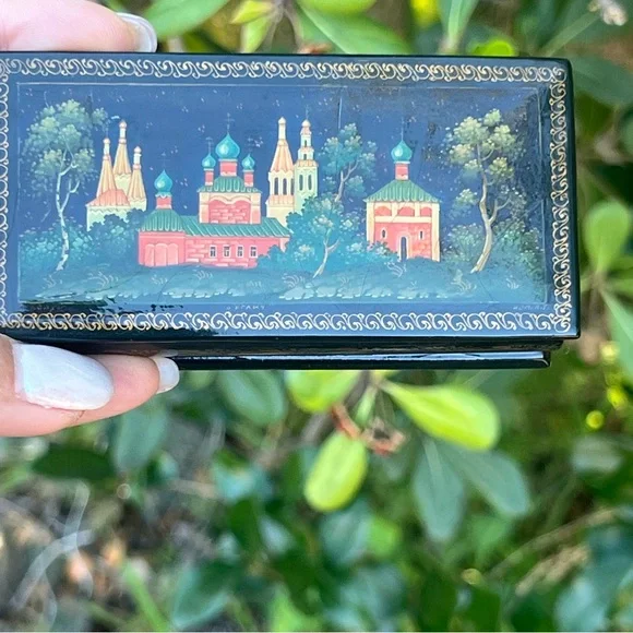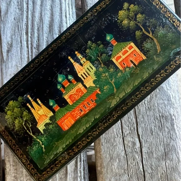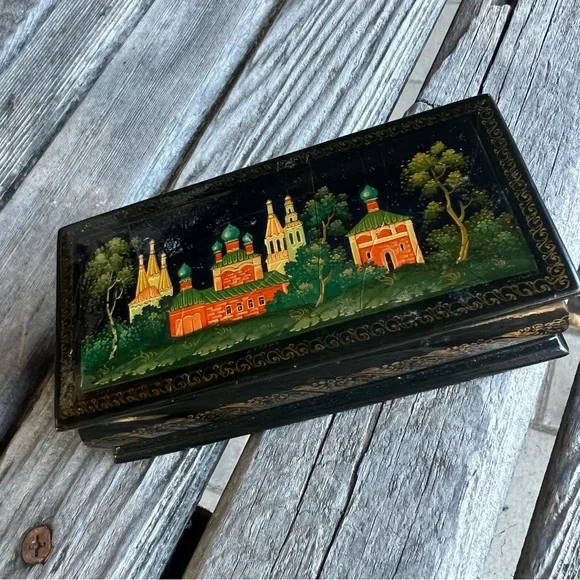Title:Vintage Russian Lacquered Paper Wood Hinged Trinket Box – 4.25”x2”x1”, Good ConditionDescription:This beautiful vintage Russian lacquered paper wood trinket box is a timeless piece of traditional craftsmanship. Featuring a hinged style opening, it is both functional and decorative, perfect for storing small treasures, jewelry, or keepsakes.Measuring approximately 4.25 inches by 2 inches by 1 inch, this rectangular box is compact yet versatile. It is in vintage good condition, with vibrant lacquer detailing that highlights its artistic charm. Minor signs of age add character and authenticity, making it an excellent addition to any collection or as a thoughtful gift for vintage décor enthusiasts.Features:•Handmade lacquered paper wood construction•Hinged style opening for easy access•Dimensions: 4.25” x 2” x 1”•Vintage good condition with minor wear•Perfect for jewelry, keepsakes, or as a collectible décor pieceKeywords for Search Optimization:Vintage Russian trinket box, hinged lacquered box, Russian lacquerware, paper wood box, collectible jewelry box, vintage storage box, small decorative box, handmade Russian art, vintage keepsake box, unique vintage gift.Tags:#RussianLacquerware #VintageTrinketBox #HingedBox #DecorativeStorage #KeepsakeBox #VintageRussianArt #HandmadeVintage #UniqueGift