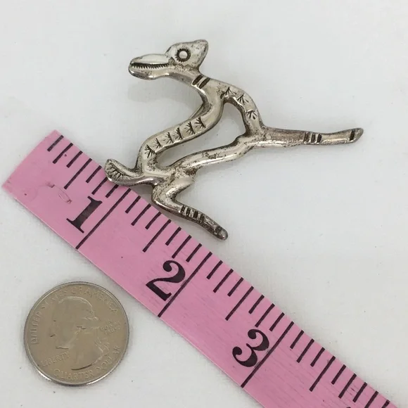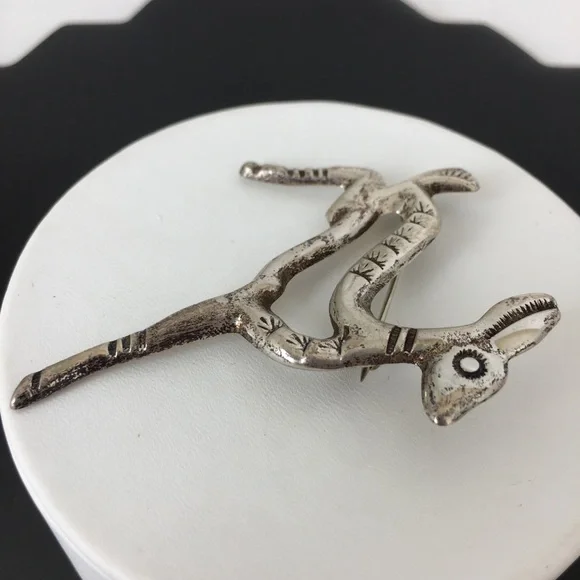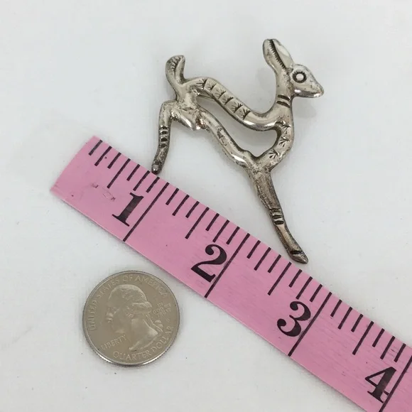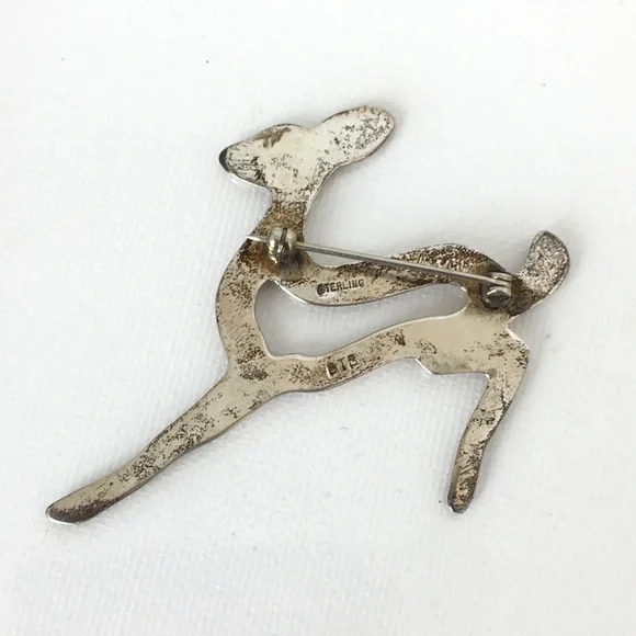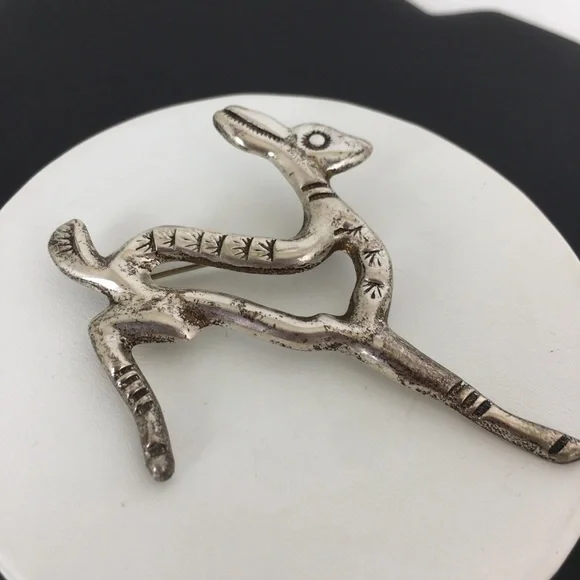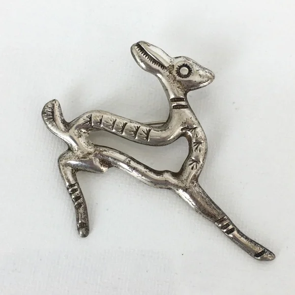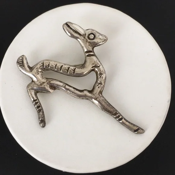 Vintage Southwestern Leaping Deer Buck Pin Brooch Sand Cast Native American Style •Vintage western design, with an etched finish.•Hallmark sterling silver, on the back.•Makers mark BTB•Deer buck, in a leaping motion.•Acid tested, positive and it is genuine silver.•Gift box or bag included.Good vintage condition with normal, light, tarnish patina.Measures 2.3/4” x 2”Questions? Leave a comment below!Tags: holiday pin, brooch, Christmas gift, holiday gift, western, handmade, southwest, sterling silver, old estate jewelry, collectible, fine jewelry, cowgirl, sand carved, sandcast, Navajo, Taxco, raindeer.Location 002