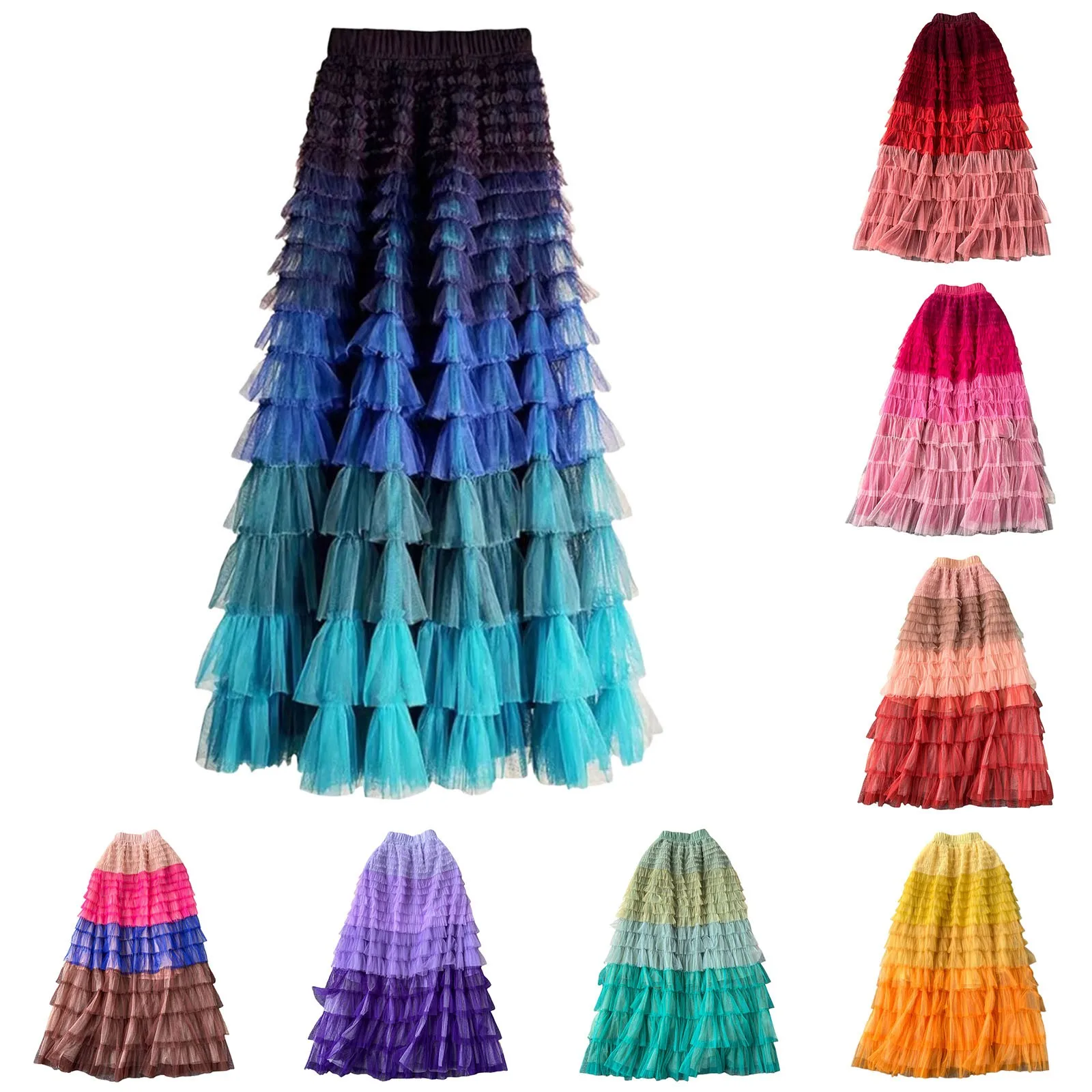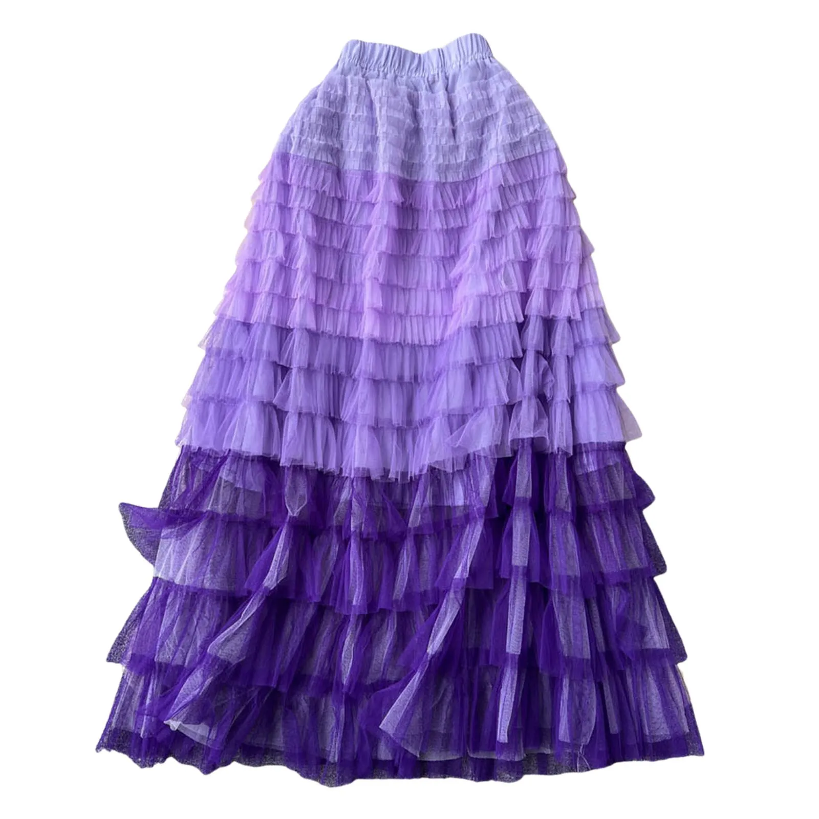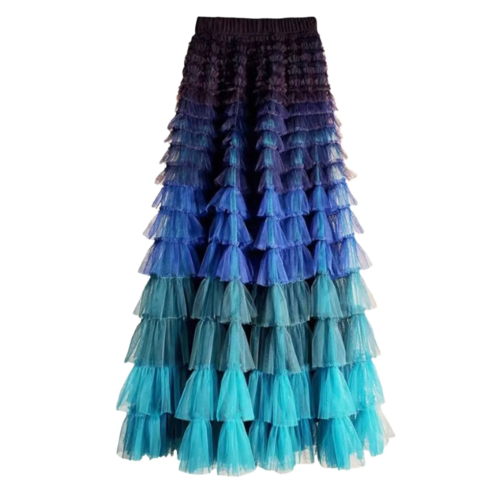 Women's -layered ruffled gradient tulle skirt Pleated high-waisted puffy maxi skirt Fairy cake dress Long tutu party dress
