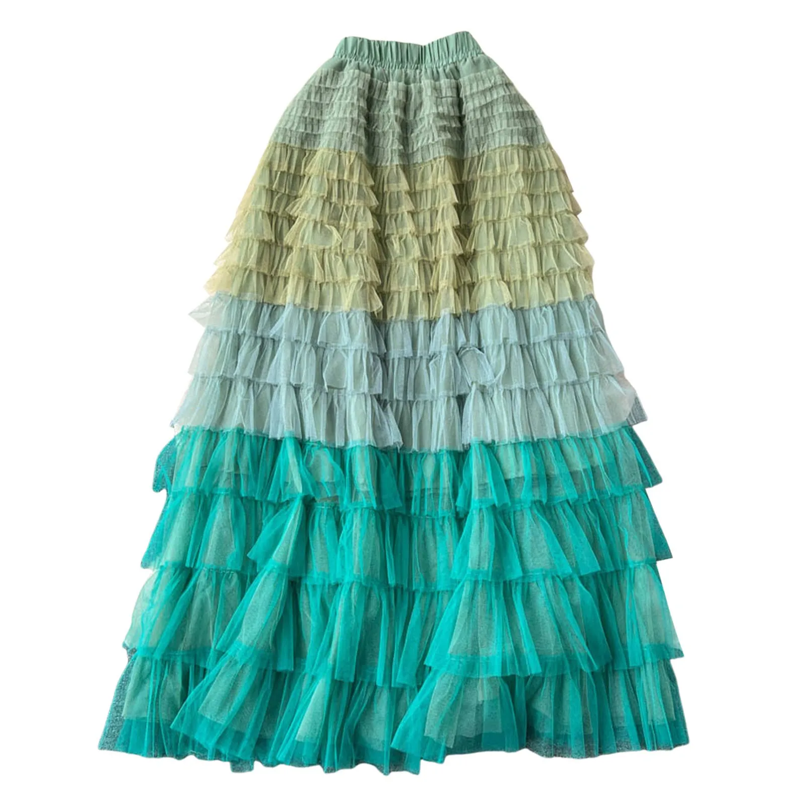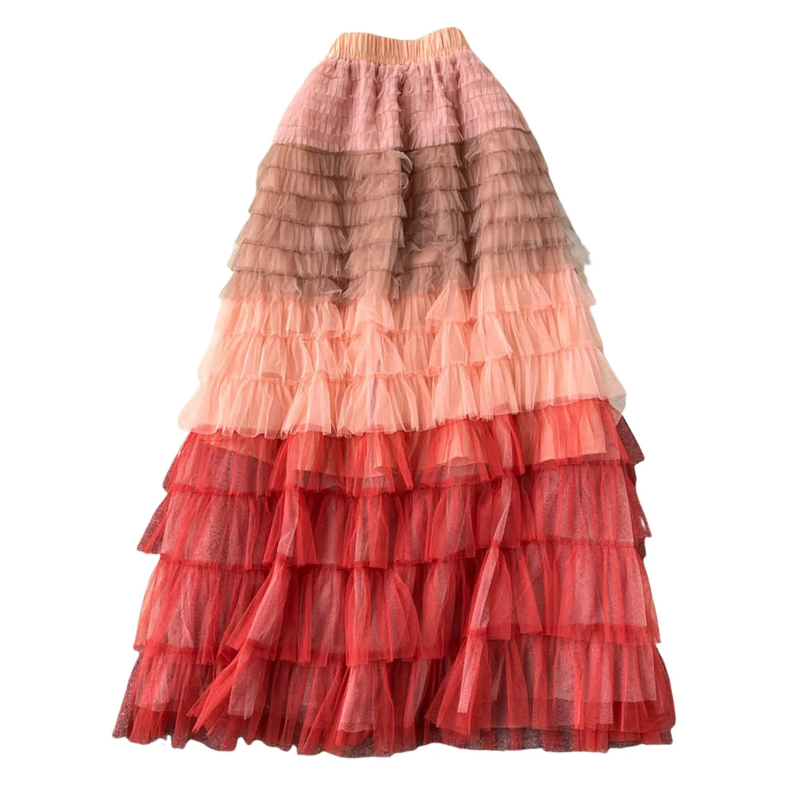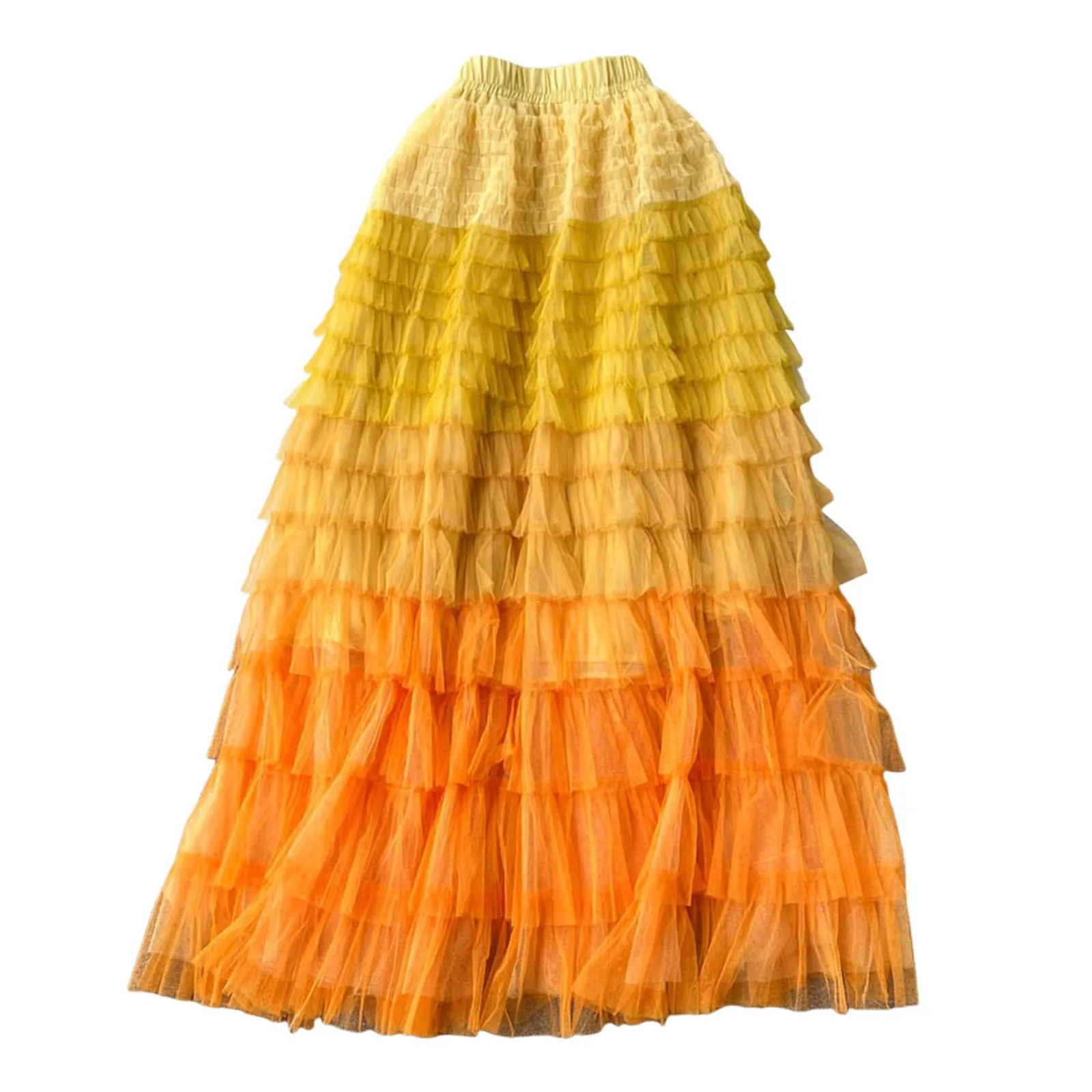 Women's -layered ruffled gradient tulle skirt Pleated high-waisted puffy maxi skirt Fairy cake dress Long tutu party dress