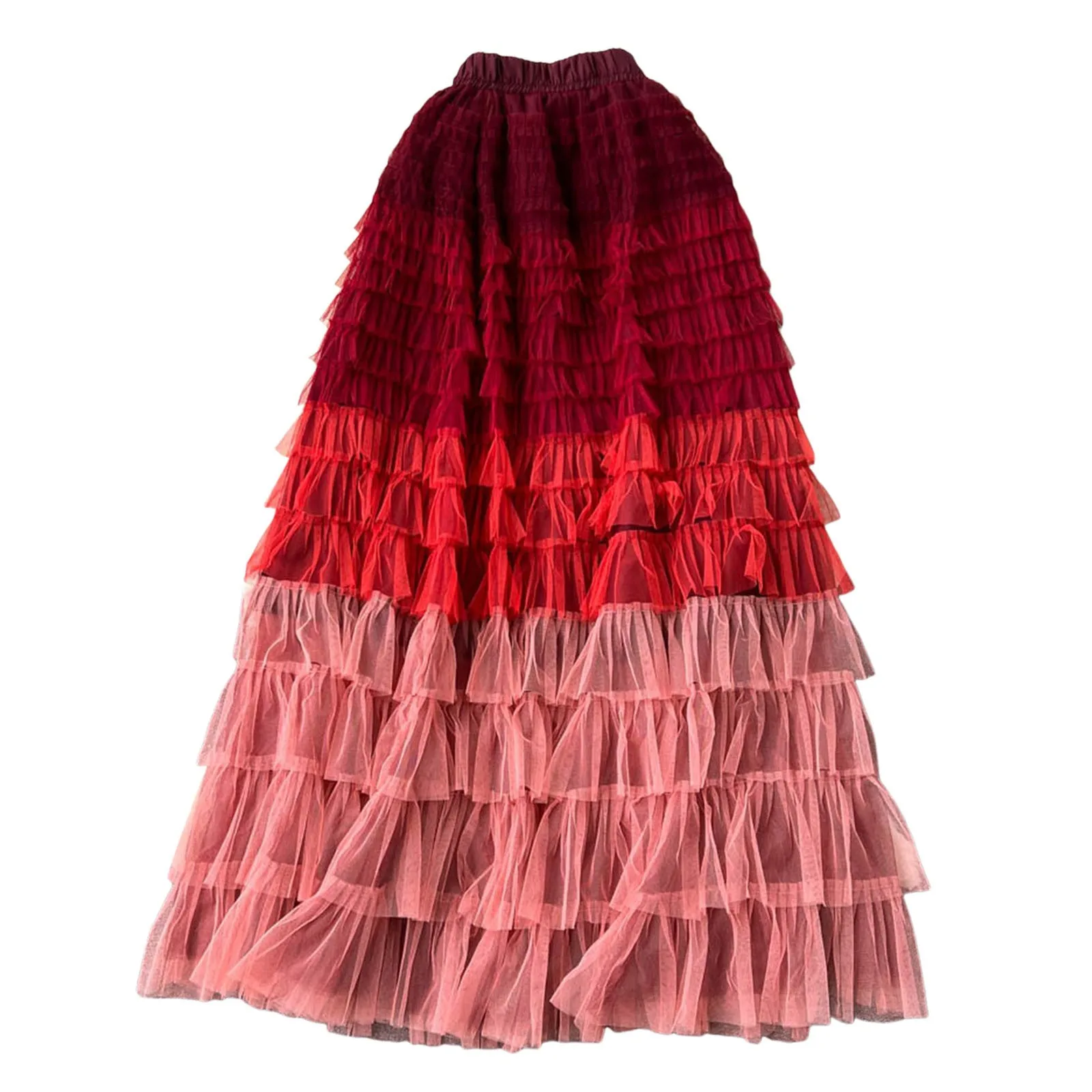 Tulle gradient patchwork maxi skirt, sweet and cute cake maxi skirt, ruffled mesh layered midi skirt, pleated fairy tulle skirt, evening dress, elastic waistband, high waist, flowy swing, A-line shape, solid color