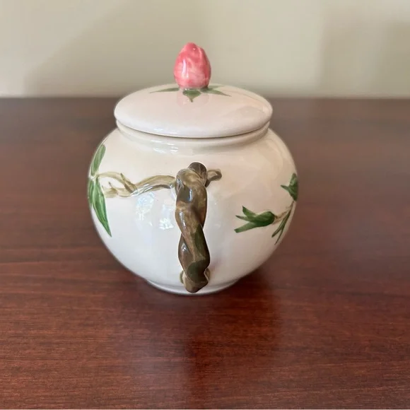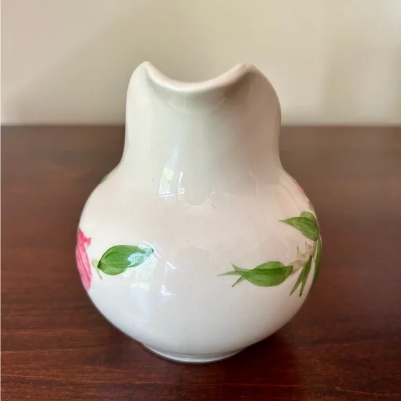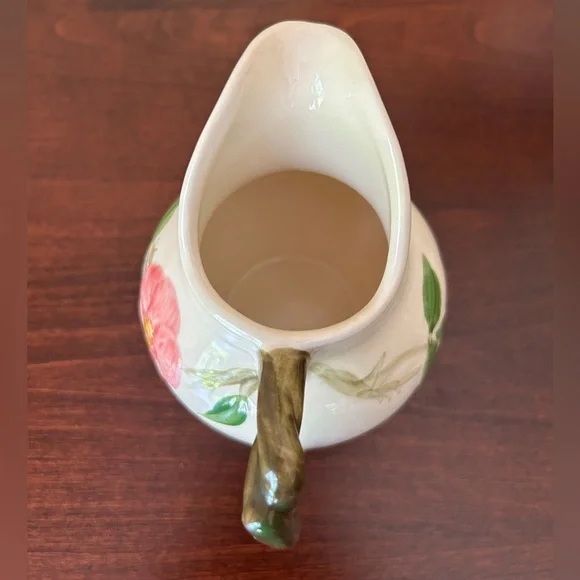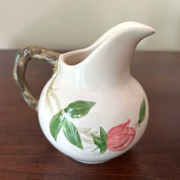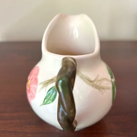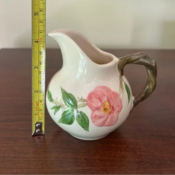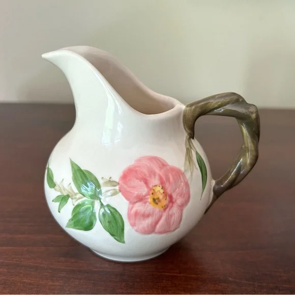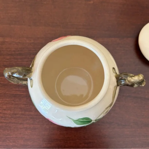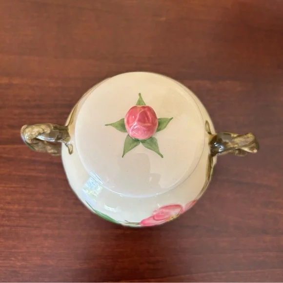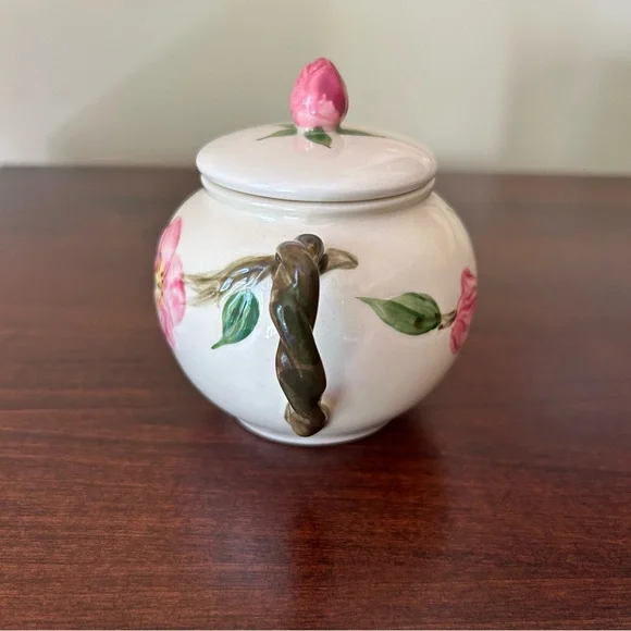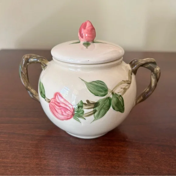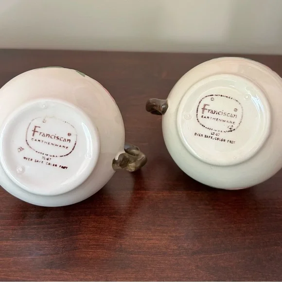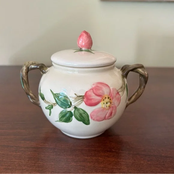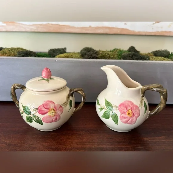 Vintage Franciscan Earthenware Desert Rose Sugar Bowl With Lid and Creamer Set. Manufactured by Franciscan Earthenware made in the USA. This piece was made in 1967, evident from the "22-67" and "31-67" markings on the bottoms. Desert Rose was a popular pattern of a hand-painted floral design.It was produced from 1941 to 2004. It's inspired by the beautiful pink rose rugosa flowers. Items are oven-safe and color fast. Sugar Bowl is approximately 4 1/4" high (to top of rose), 3" round at the opening.Creamer is 4 1/4" high, slightly over 3" wide as its widest section. In great pre-owned condition with no chips, cracks or color fading. Please see all photos for condition.A beautiful collectible set!