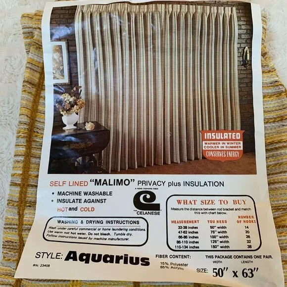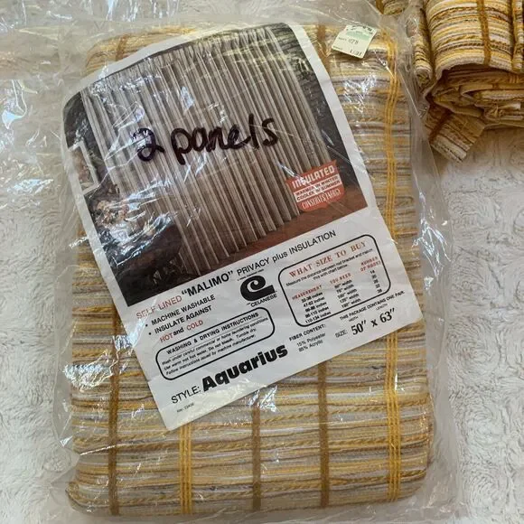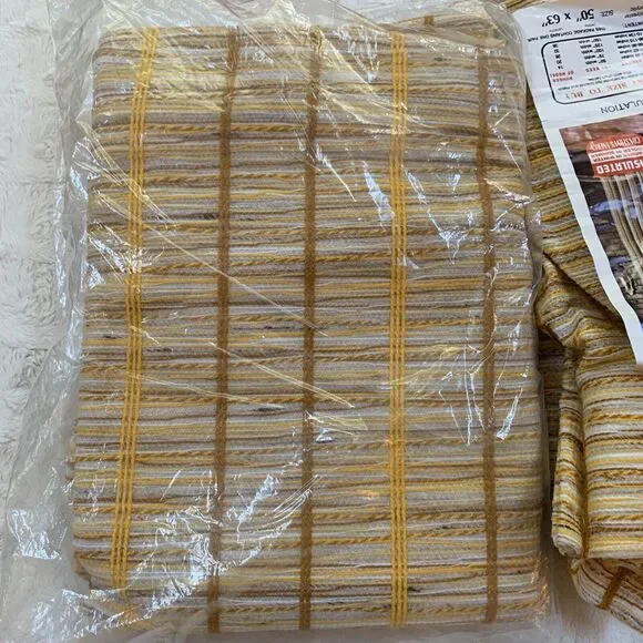 Both pair are new in package never used. Opened one to get better pictures. Gorgeous!Add elegance and privacy to your home decor with this stunning set of Vintage Weave Pinch Pleated Drapes. The gold-colored panels are made of a comfortable Polyester Blend material that is light filtering and machine washable for easy maintenance. Measuring 50x63 inches, they are perfect for any room in your home.These drapes come in a set of 2 and feature a beautiful pinch pleat curtain heading that adds texture and style to your space. The drapes are also insulated, making them perfect for keeping your room warm or cool. With their vintage look and unique features, they are sure to enhance any room in your home.