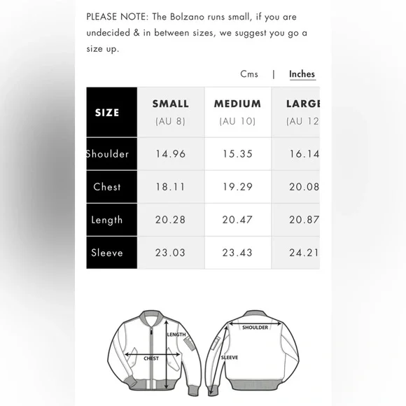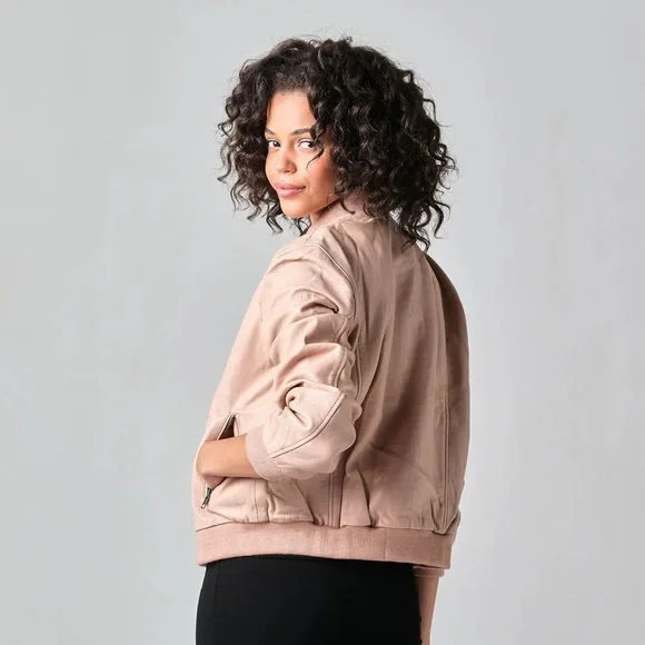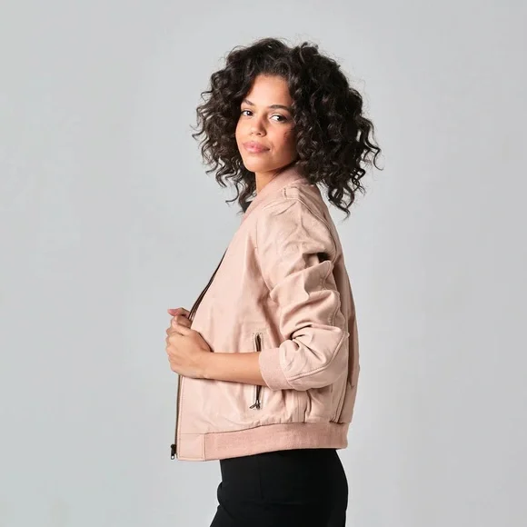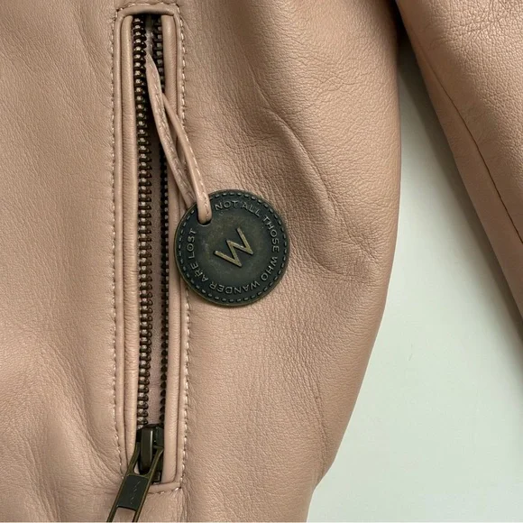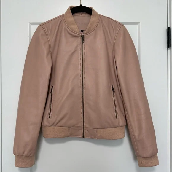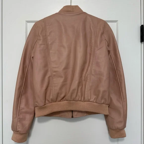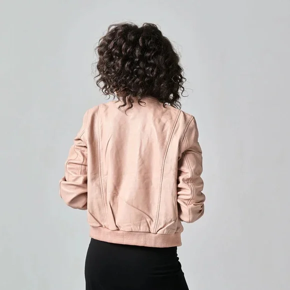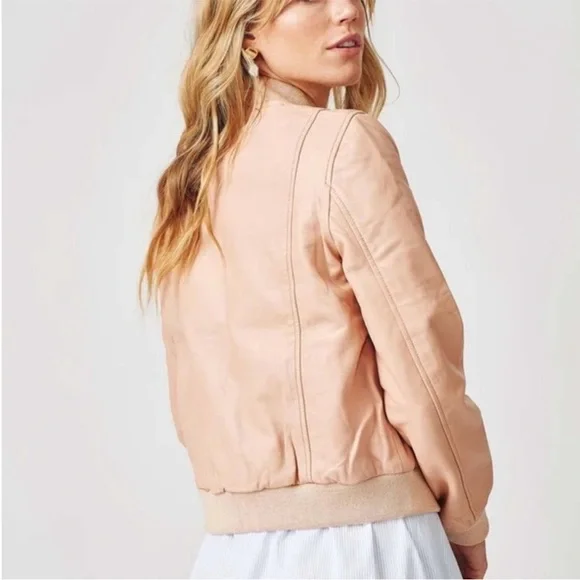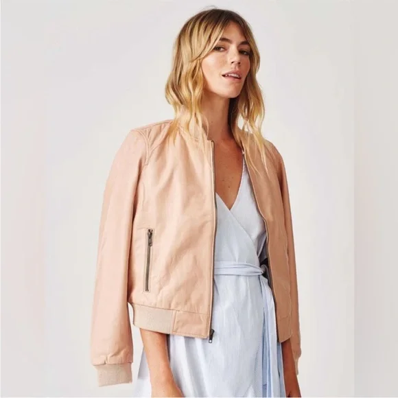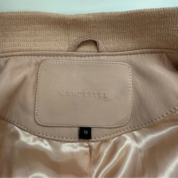 Wanderers Travel Co. Women’s Leather Bolzano Bomber in Blush Size AU 10/MediumAccording to the brand website, this style runs small. Please see measurements below. The Bolzano bomber is the perfect casual cool companion for wandering alpine scenes or closer to home! With ribbed elastic cuff, collar and hem and crafted from the softest full grain lamb leather this classic style with a Wanderers twist is made for adventuring near or far.Full grain lamb leatherZipper closureSporty style ribbing at cuff, hem and collar2 x external open pocketsCotton and satin liningExcellent condition, no flaws to note. My approximate measurements:Shoulders 15”Pit to pit 19”Length 21”