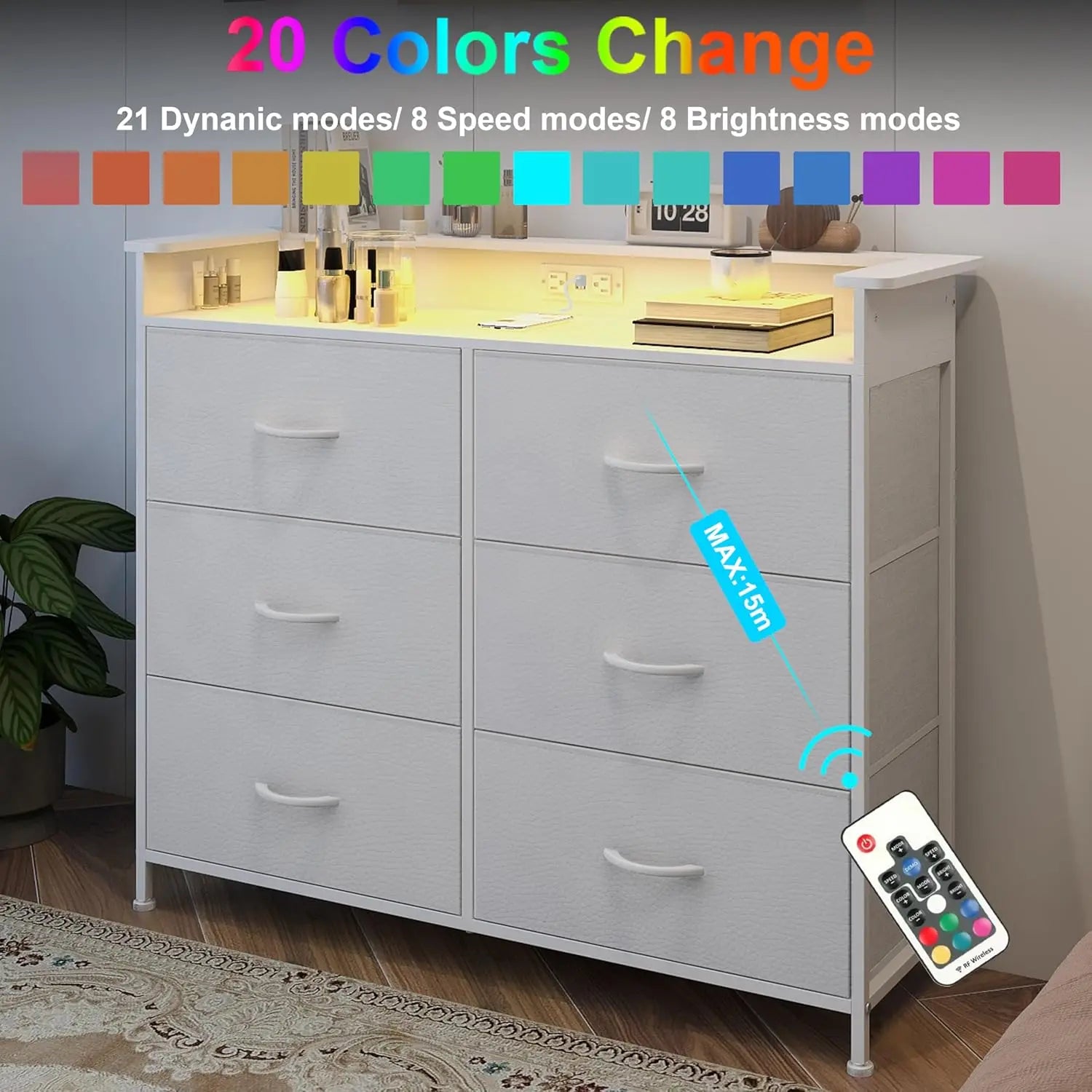 White Dresser For Bedroom With Charing Station And Led Light 6 Drawer Dresser With Pu Finish Fabric Chest Of Drawers For Closet Living Room Hallway Sturdy Steel Frame Double Wooden Tabletop