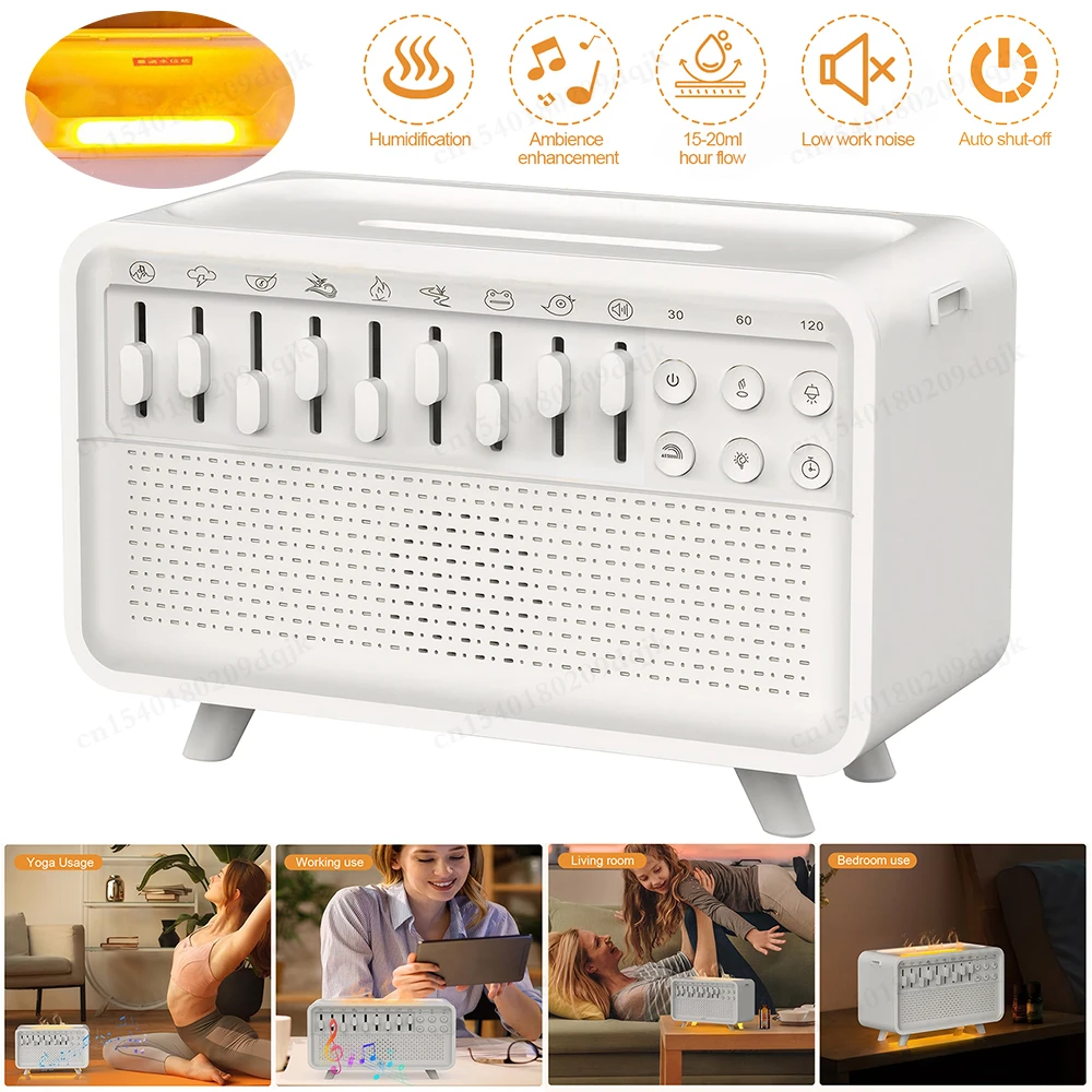 LED White Noise Speaker Waterless Auto-Off Sleep Sound Machine Essential Oils Humidifier for Bedroom Living Room Bedside Specification: Origin: Mainland China Rated power: 10W Power input: 5V/2A Input current: 2A Input voltage: DC5V Product color: white Water tank capacity: 150mL Maximum atomization volume: 15-20mL/hour Speaker power: 3W Material: PP, ABS Product size: 200x90x130mm/7.8x3.51x5.07in Packaging size: 225x115x170mm/8.78x4.49x6.63in Bluetooth audio function: This device can be connected to your mobile phone via Bluetooth. You can enjoy music through your mobile phone. Device name: MY-20 Warm tone night light function: 3 levels of brightness are adjustable, you can adjust the brightness of warm white. 30/60/120 minutes timer function: The device can be set to automatically shut down for 30/60/120 minutes, which is convenient for users to control working hours. After the countdown ends, the device automatically turns off all functions such as humidification, white noise, audio, night light, etc. Easy to fill and clean the top: Considering that many users are concerned about the water filling method and cleaning difficulty of the product, we chose a practical detachable cover design for this device. Anti-dry burning automatically turns off the atomization function: When the water in the water tank is detected to be exhausted, the machine will automatically stop the atomization function to protect the machine to the maximum extent Aid sleep function: Sleep music, thunderstorm, bonfire, creek, bird song, frog call, healing bowl sound, sea wave seagull; 8 groups of music with slider control, analog mixer adjustment slider. This button can adjust the overall sound volume. Built-in 8 sets of unique natural sounds. These sounds help relax and relieve stress. You can adjust different volumes to play all eight tracks at the same time, mixing the best personalized effect. Set up a separate slider control for each different sound, simulating the action of a studio mixer, so you can turn up or down the corresponding sound according to your preferences to achieve the most personalized effect. Humidification and aromatherapy function: Press the "Mist" button to turn on and adjust the flame light brightness (the "flame" sways in the wind, bringing out a light mist, creating a dreamy atmosphere. This humidification diffuser is perfect for ultrasonic aromatherapy, collecting light and mist to create a realistic flame effect. Add 3-5 drops of your favorite essential oil to relieve fatigue, moisturize your skin, and ensure a pleasant atmosphere to relax you. Enjoy the dual effects of hydrotherapy and aromatherapy through water and ultrasonic vibration; breathe fresh and clean air to promote health Please read this manual carefully before using the product 1. Make sure to connect this product with a 5V/2A charger 2. Open the top cover and pour water into the water tank. Do not exceed the highest water level marked. Be careful not to pour water into the narrow space of the air outlet 3. You can drip 3-5 drops of your favorite water-soluble essential oil. Be careful not to use oily essential oils to avoid clogging the atomizer port 4. After correctly connecting according to the above steps and precautions, press the power button to enter the working mode