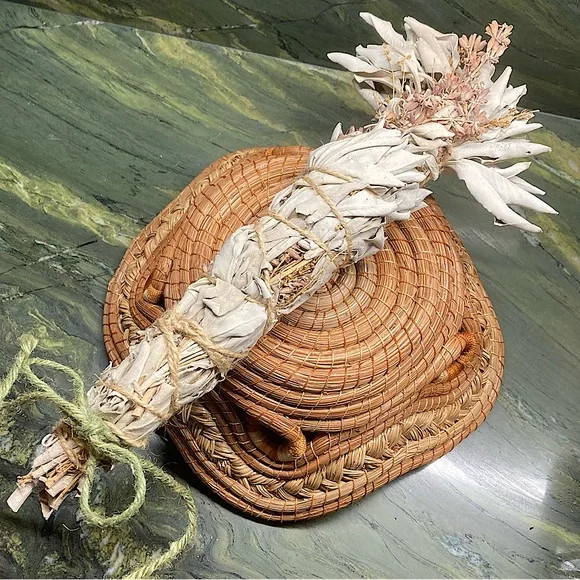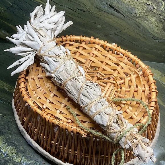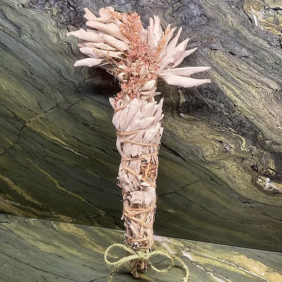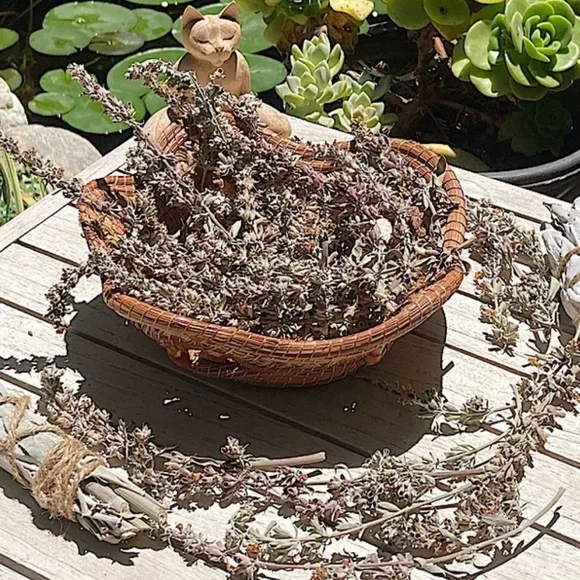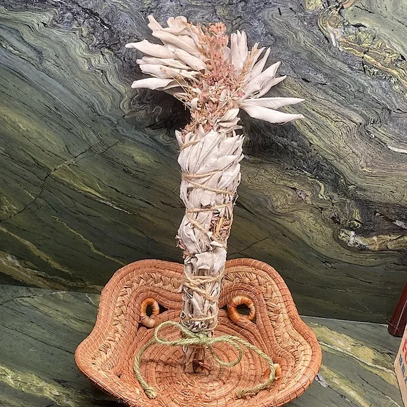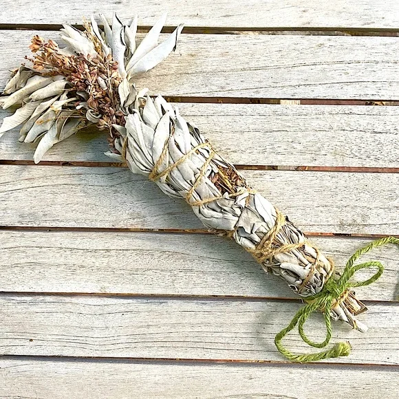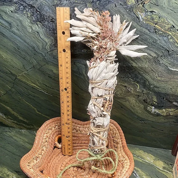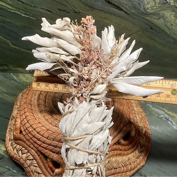 White Sage with Sage FlowersExtra Fancy tall and wide.Organic Dried Floral Herbal Bouquet.Hand Crafted Home Decor.Holiday Gift for Nature Lovers.Premium Organic Salvia apiana leaves and stalks blended with the magenta flower stalks.Extra tall with a wide fanned out top.Forming a showy, highly fragrant, all natural floral display.Fully dried and will last forever.Flowers and leaves have faded to a mellow softness for a perfect boho basket decor.Premium Organic CA white sage is packed on the inside with magenta flowers.This Specialty Sage Stick with extra fancy floral arrangement evokes an all-natural, vintage, Victorian vibe.All sage and flowers are grown on my farm.Organically grown and sustainably harvested.So you can be sure that everything is ethically sourced.I grow and make all sage sachet sticks myself.Perfect as a natural incense and safe to burn at a garden party or your personal space.Delicate yet will last for years.Tied with natural jute twine and a cotton string bow.My artisan creations are always one of a kind.Freeform, rustic, farmhouse style.Naturally fragrant.Eco friendly, sustainable, botanical, organic, artisan, handmade, hand crafted, flowers, Cottagecore, Fairycore, nature, garden, meditation, gift, aromatherapyArrives in a Gift Bag.All photos are taken on my farm by me.Copyright ©️@randeescloset.*Please Note:All of My Items are approved Posh Compliant.