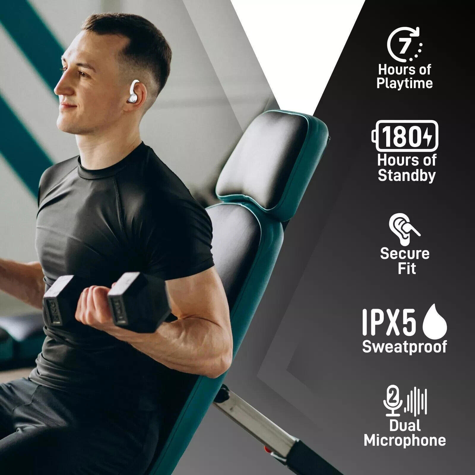 Ergonomic and sweatproof design for secure fit during any motion.