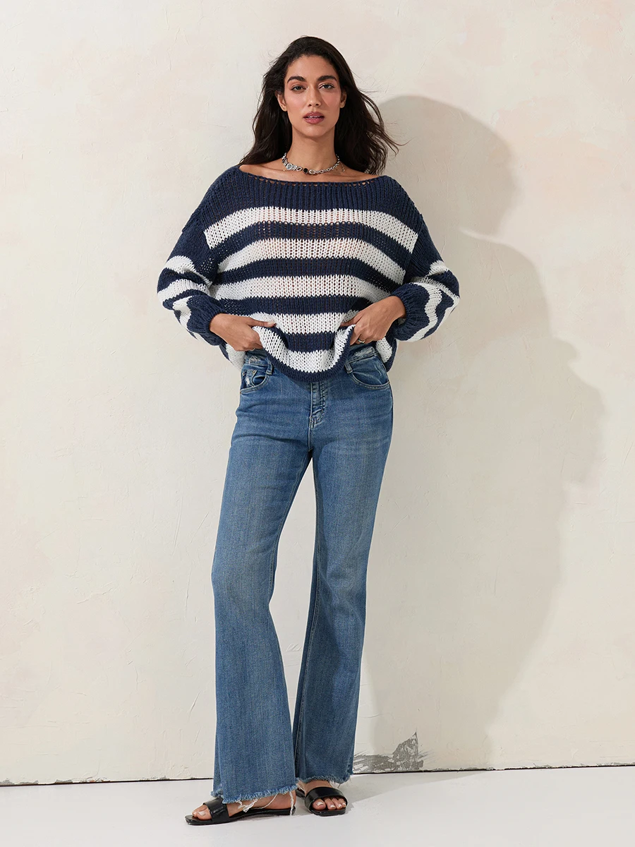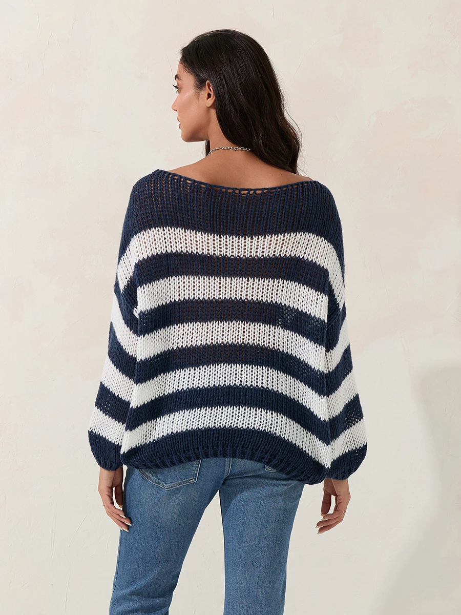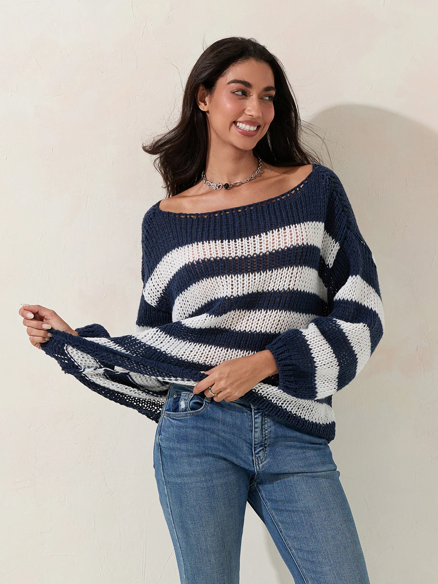 Women's Striped Sweater Vintage Loose Boat Neck Long Sleeve Pullover Tops for Fall Winter