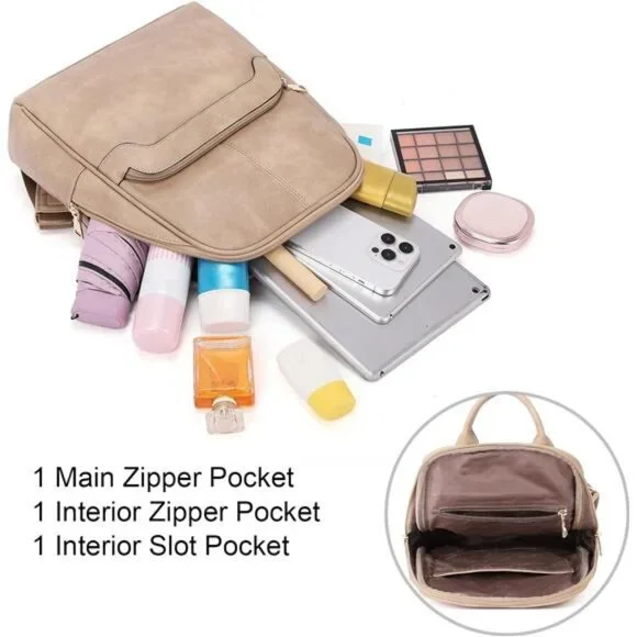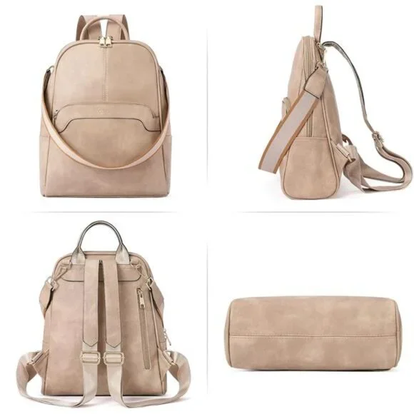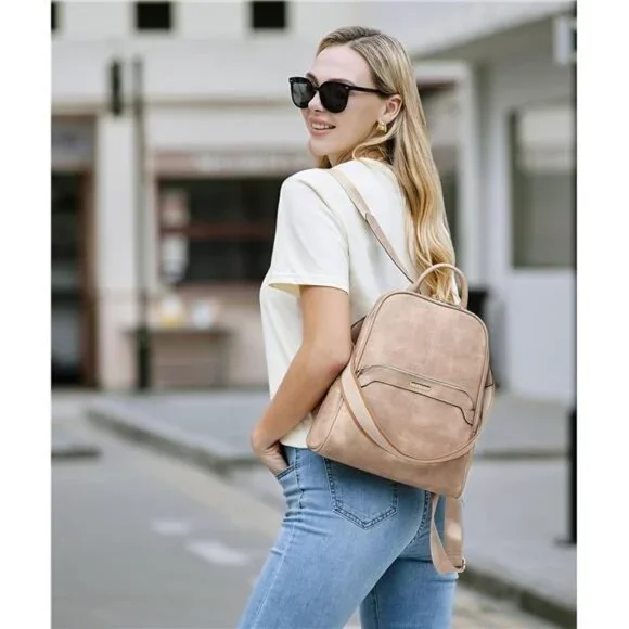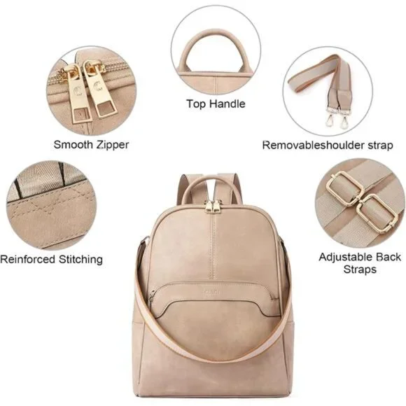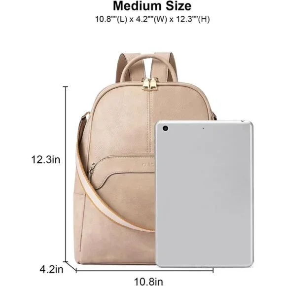 [Medium Size]: 10.8"(L) x 4.2"(W) x 12.3"(H),it is the perfect size as a Medium backpack, enough to hold a 9.7"iPad.Shoulder strap drops: 15.8". The backpack purse for women is suitable for travel, work or dating, an ideal gift for her on birthdays, Valentine's Day, Mother's Day, Women's Day, Thanksgiving Day, etc.The backpack purse is made of vegan leather, fabric lining, with smooth zipper, and the stitching is reinforced to make it more durable. Classy, simple design style, can go with any occasions, never out of date.[Stylish but Functional]: 1 main zipper pocket+ 1 front zipper pocket+ 1 back pocket + 1 interior zipper pocket + 2 interior slot pocket. Multi-pockets of the ladies backpack purse could fits your cell phone, umbrella, keys, books and other tiny items.Women backpack purse, shoulder bag, handbag. The travel backpack purse is a beautiful and fashionable, with adjustable back straps and 2 removable shoulder strap, and straps are made of nylon, comfortable and sturdy.