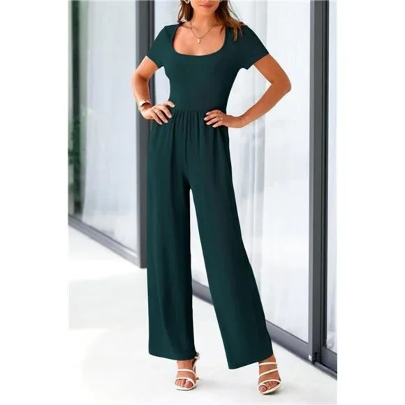 *Fabric type95% Polyester, 5% Elastane*Care instructionsMachine Wash*OriginImported*TIPS: XS=US 0-2, S=US 4-6, M=US 8-10, L=US 12-14, XL=US 16. Crafted from High-Quality Ribbed Knit Fabric, this Jumpsuit Is Soft to Touch and Offers a Comfortable Fit that Moves with you throughout the Day*EYE-CATCHING DESIGNS: Short Sleeve Jumpsuits; One Piece Rompers for Women; Square Neck Jumpsuits; Wide Leg Jumpsuits for Women; Casual Rompers; Rompers for Women Summer Dressy; Summer Clothes; Long Pants Romper; Women Jumpers and Rompers; Womens Jumpsuits with Pockets*MATCHING STYLE: Designed for Easy Matching, this Jumper Can Be Paired Effortlessly with Other Pieces for Various Looks and Occasions. Dress it Up with Heels and Statement Jewelry for a Night Out, or Keep it Casual with Sneakers and a Denim Jacket for a Relaxed Weekend Vibe*DRESSY ELEGANT JUMPSUITS: the Square Neck Adds a Touch of Sophistication, while the Wide-Leg Pants Provide a Trendy and