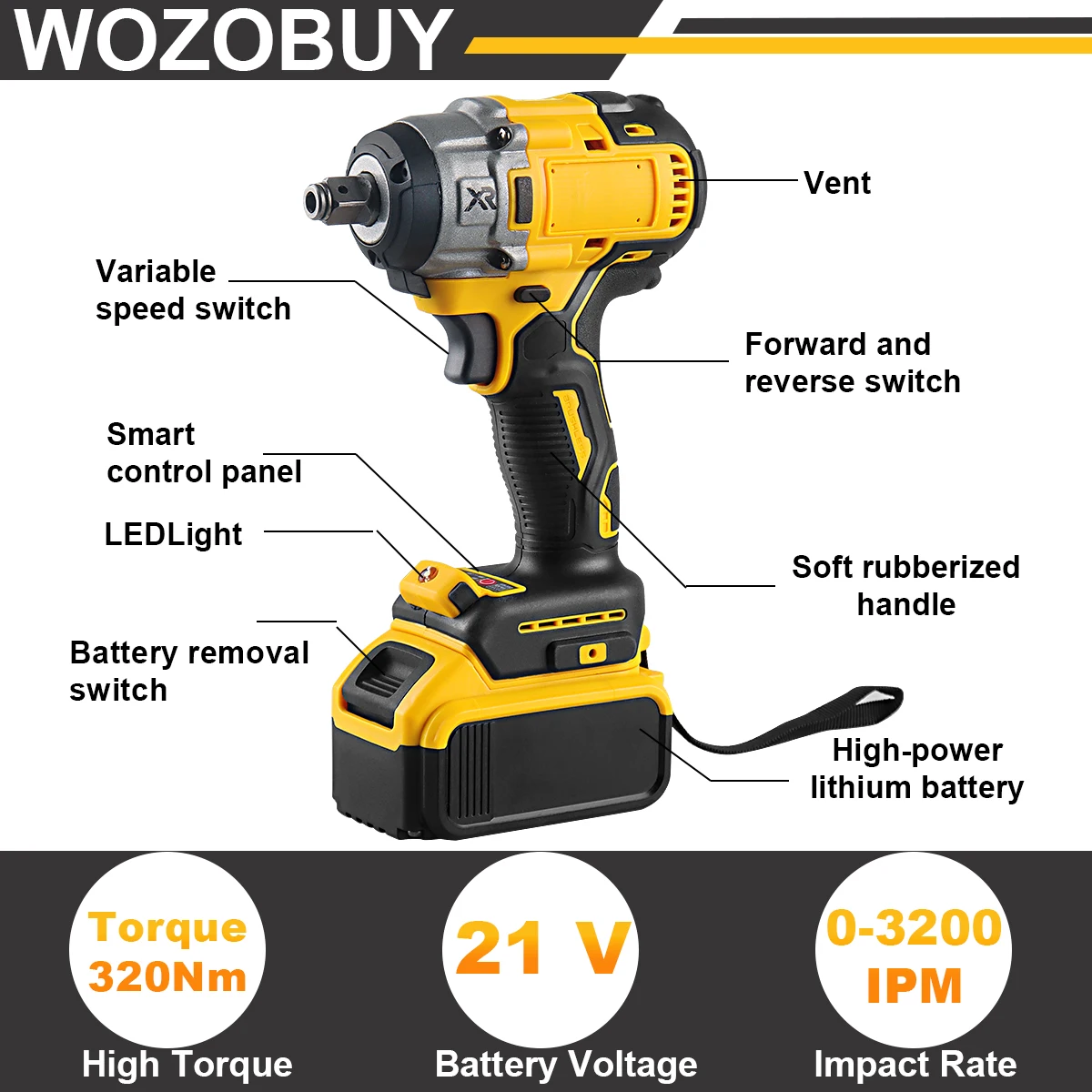 WOZOBUY Cordless Impact Electric Wrench 1/2" , Max Torque 236ft lbs (320N.m), Brushless-Power Motor, Includes LED Work Light