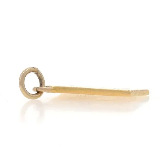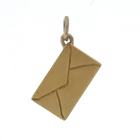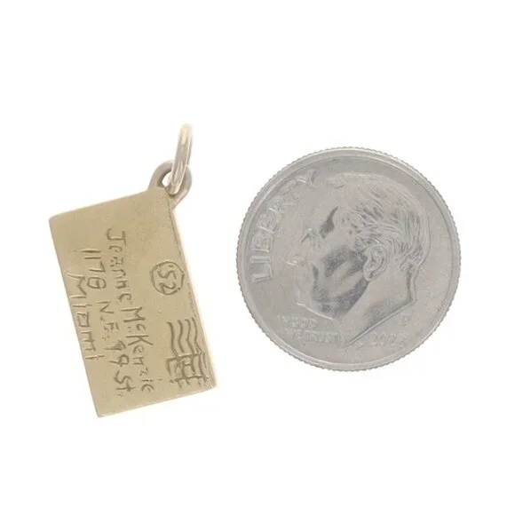 Metal Content: 14k Yellow GoldTheme: Letter Envelope, Mail Correspondence, Postal CarrierMeasurementsTall (from stationary bail): 27/32" (21.3mm)Wide: 11/16" (16.9mm)Interior of top bail opening measures (east to west): 3.4mmWeight: 3.3 GramsInscription(s): " '52 ""Jeanne McKenzie1178 N.E. 99 St.Miami"Condition: Pre-OwnedProfessionally tested to guarantee metal content.