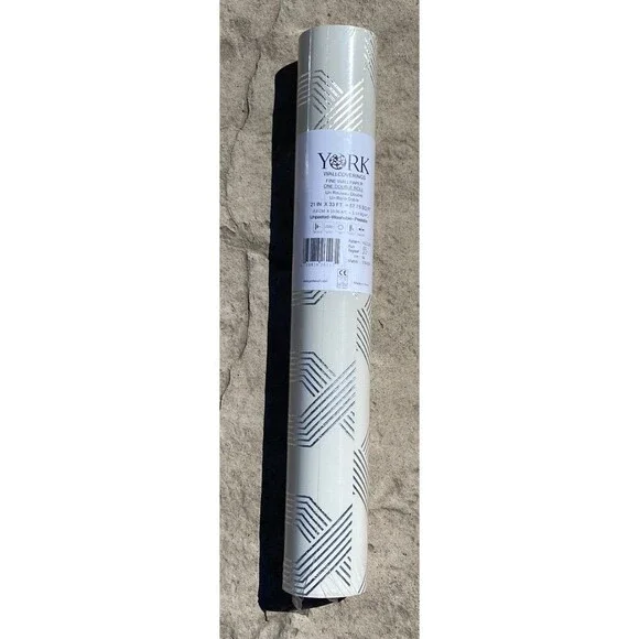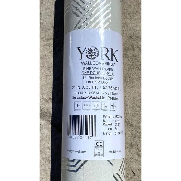 York Wallcoverings Wallpaper Y6221204 MCM VIVA LOUNGE Double Roll Grey SilverYORK Fine Wallpaper, double roll = 57.75 Sq. Ft. The Viva Lounge pattern is made up of Geometric Trellis lines in metallic silver on light grey background.Width:21 in (53.34 cm)Roll Length:33 ft Double RollPattern Match:StraightRepeat Length:25.2 in (64.01 cm)Material:NonwovenAdhesive:UnpastedMaintenance:WashableRemoval:Strippable