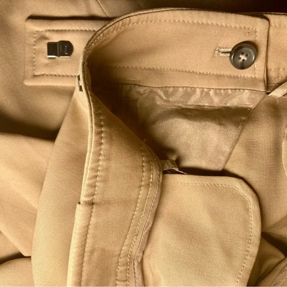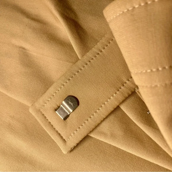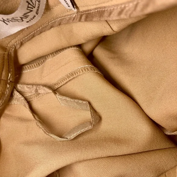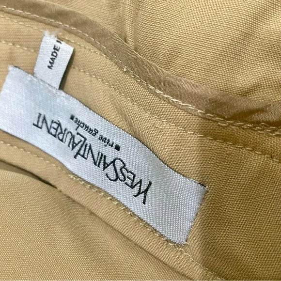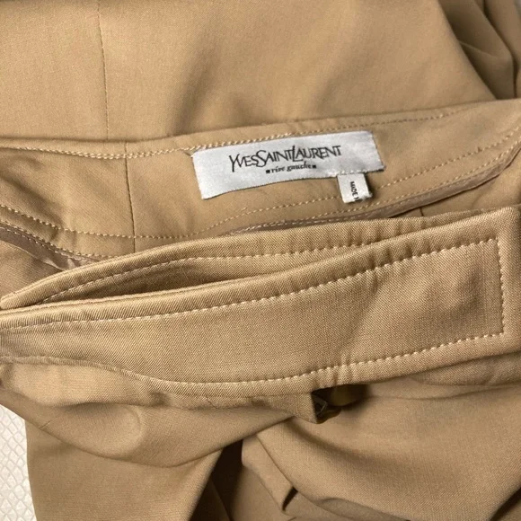 These vintage Yves Saint Laurent Rive Gauche Sz30 pants are a spring staple! The color is a perfect neutral . These pants have a medium weight wool feel, so they will be great as a transitional piece from winter to spring. The front of these pants are pleated and have a center pressed fold. They are very high waisted with a 12 1/2" rise. There is an off-center button closure with a flat metal hook and eye and center metal zipper. The back of the pants have darts along the waistband and there are two functional side pockets. These pants also have slim belt loops and the finished hem has an additional 2" of fabric if you want to let them out for more length. Made in Italy . 100% Wool.