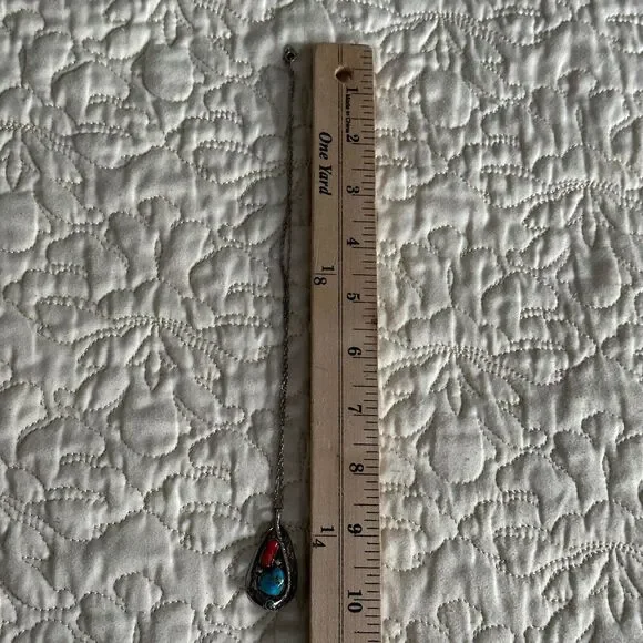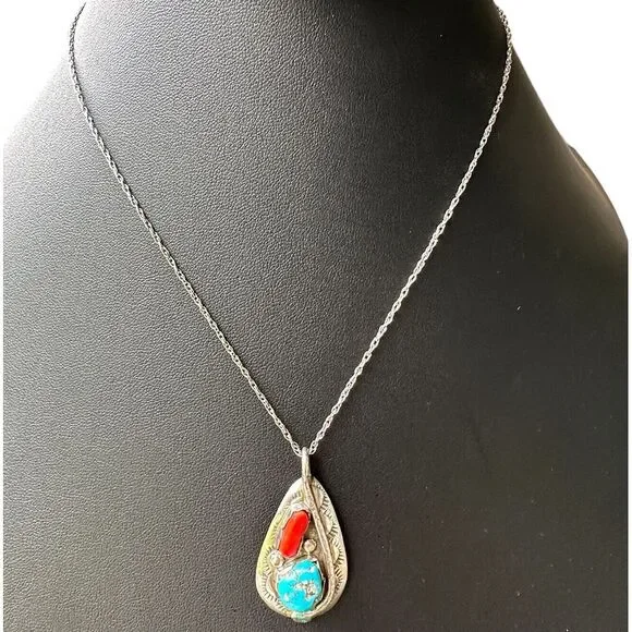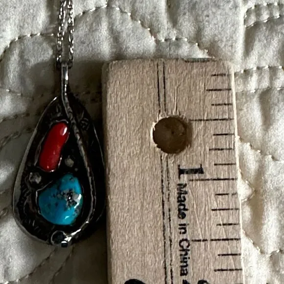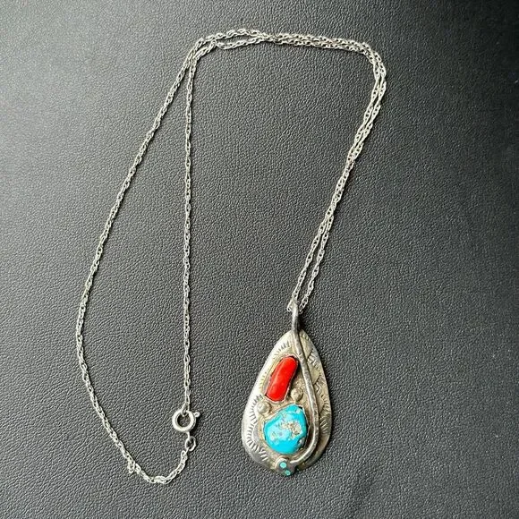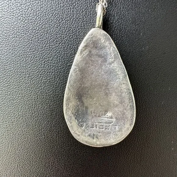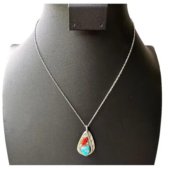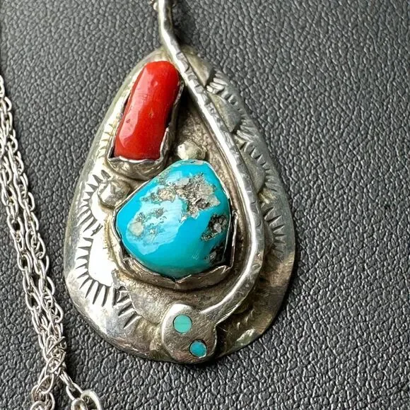 This Zuni Effie Calavaza Pendant Necklace is a beautiful piece of vintage jewelry. The necklace is made of 17" stamped 925 sterling silver and features a stunning natural turquoise and coral stone cabochon design. The pendant is handmade and signed by the artist, making it a unique and original Native American piece 10.2 grams. The necklace is perfect for all occasions and would make a great addition to any fine jewelry collection. The antique-inspired design and vintage feel make it a true treasure. Made in the USA, this original piece is sure to impress.